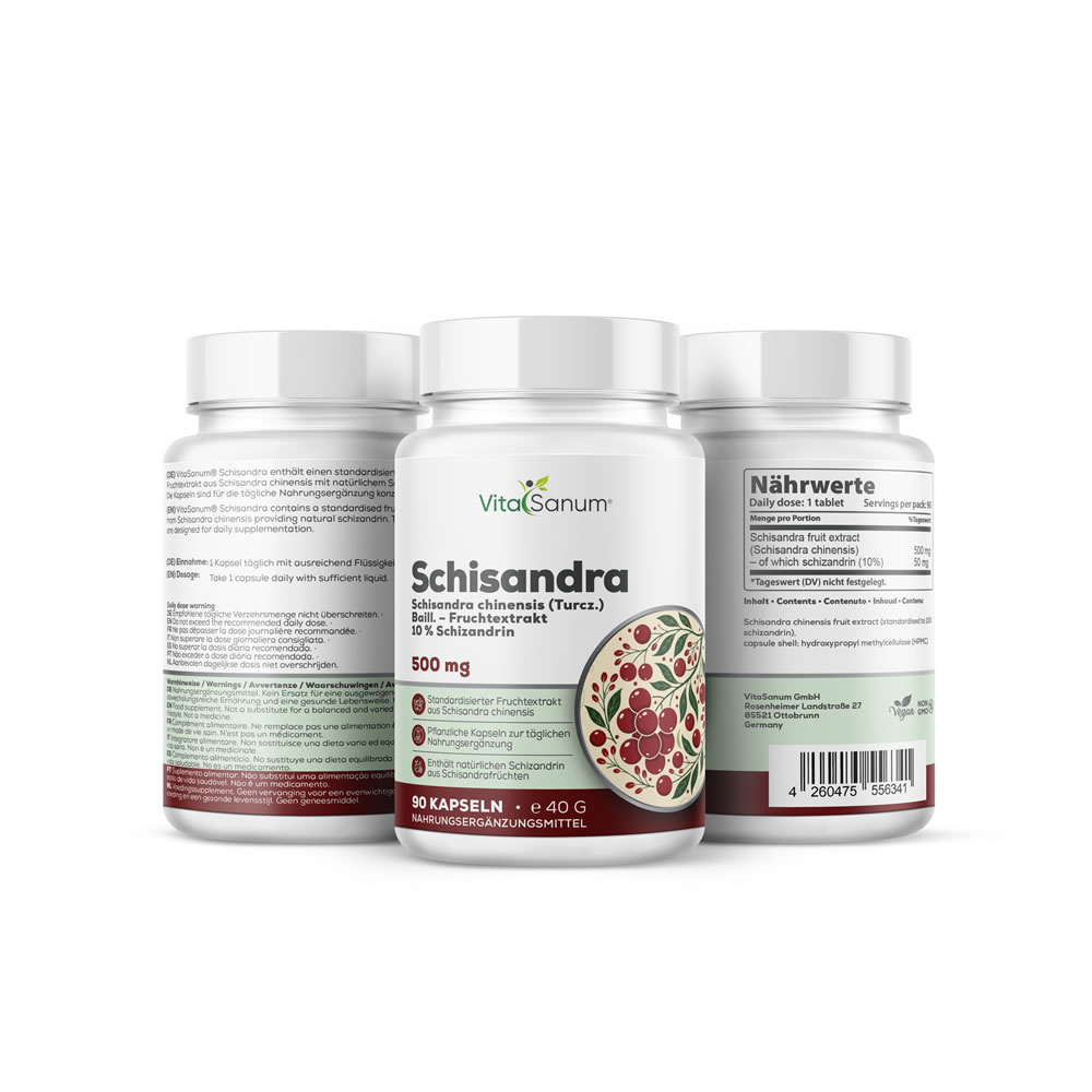VitaSanum® Schisandra 500 mg enthält einen standardisierten Fruchtextrakt aus Schisandra chinensis (Turcz.) Baill., titriert auf 10 % Schizandrin. Die Kapseln sind für die tägliche Nahrungsergänzung konzipiert und eignen sich für Erwachsene, die ihre Ernährung gezielt mit einem pflanzlichen Extrakt ergänzen möchten.