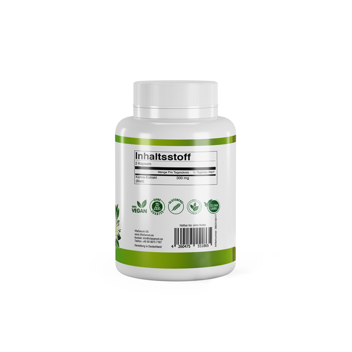 Inhaltsstoff Menge pro Tagesdosis (2 Kapseln) Kanna-Extrakt 300 mg (Blatt)