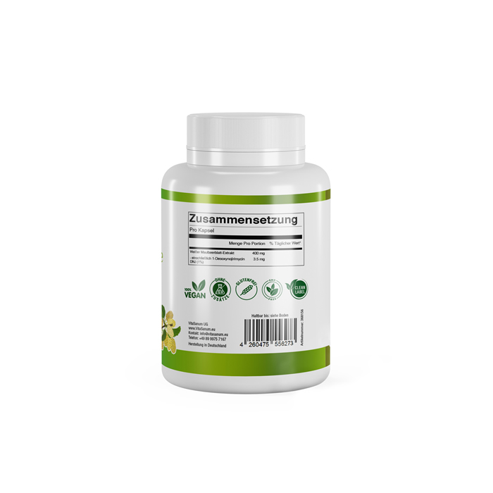 Der Extrakt ist auf 1 % DNJ standardisiert und liefert pro Kapsel 330 mg Maulbeerblatt-Extrakt. Die Rezeptur ist vegan und wird in leicht schluckbaren Kapseln angeboten.